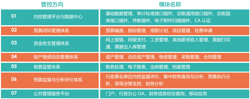 ◆ 资金资产高效安全:以预算法为准绳,政府会计准则为基础, 建设以风险管控为核心的内控型财务管理平台,保障国有资产安全完整和使用高效。