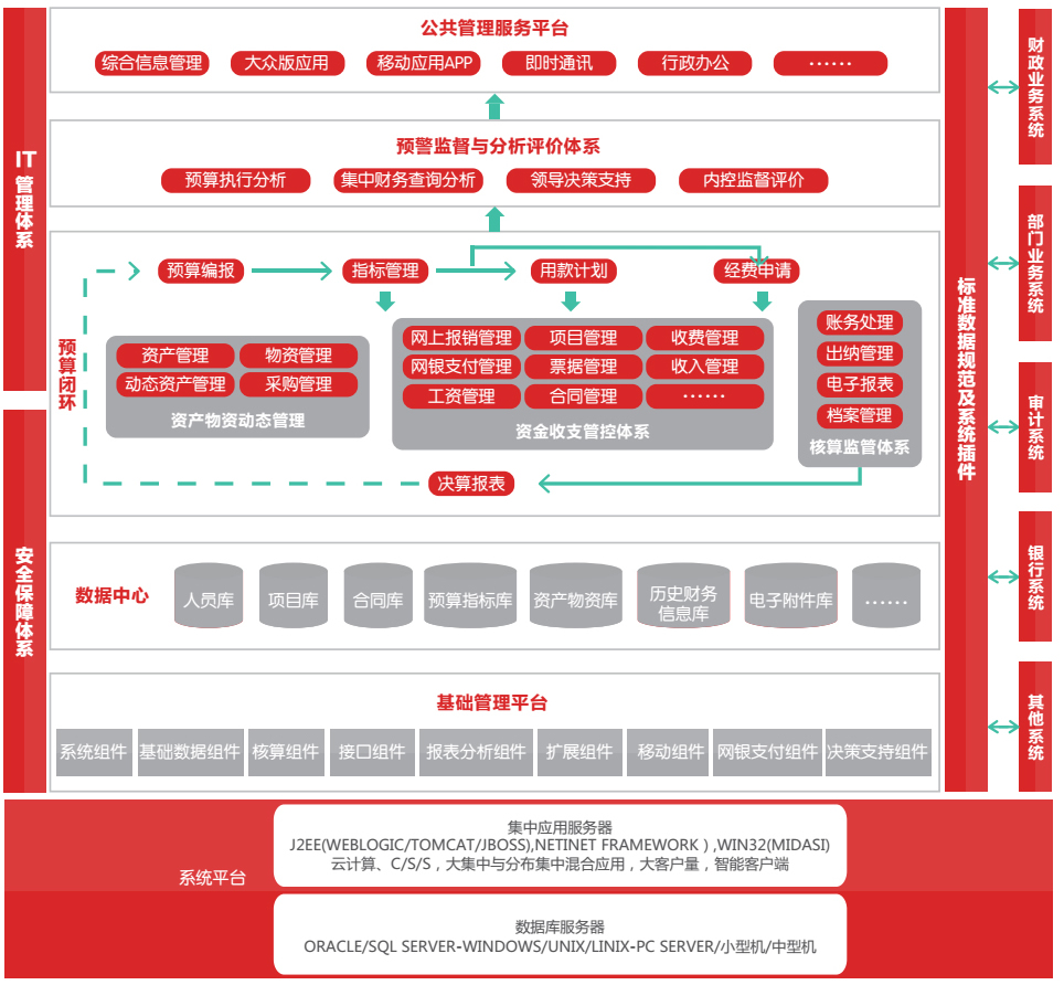 ◆ 资金资产高效安全:以预算法为准绳,政府会计准则为基础, 建设以风险管控为核心的内控型财务管理平台,保障国有资产安全完整和使用高效。