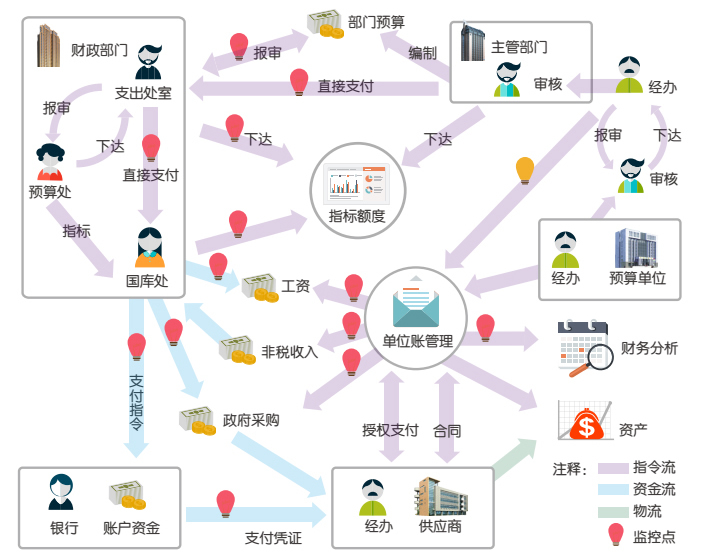 建立基于预算管理、资金收支管理和资产物资管理过程的核算监管体系,将财务人员从过去的事后核算处理延伸到整个财务管理过程的参与,加强财务人员对资金申请到业务执行过程中的合规性、合法性监控。主管部门对下级单位亦可通过规范会计科目体系,设定财务制度流程等方式实现统一管理、实时监督。