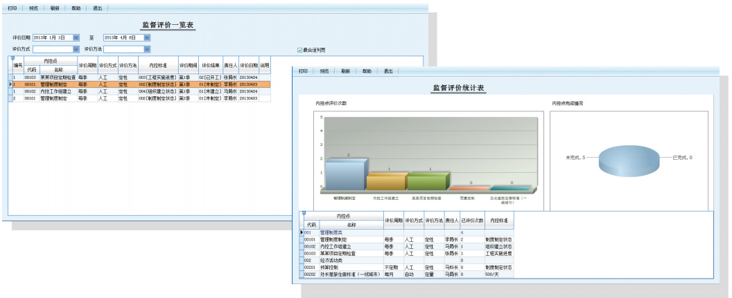 预警监督与分析评价管理的对象包括两方面的内容,一方面建立业务管理与监管体系业务数据之间的关联,对经济活动管理过程以及部门间信息交换进行分析,从中抽取主要业务信息流和全域信息流。形成一个涵盖不同指标来源、支出类别、业务部门、项目投入方向的全部资金,支持多种数据采集手段、数据格式的,有图表、有分析的, 多层次、角度,多指标体系的分析监管系统,提供数据比对、审计追踪、综合分析及领导决策支持等信息。另一方面通过设定控制评价体系和标准,由人工或系统自动进行控制评价,并对控制评价的结果和记录进行统计分析,实现对行政事业单位内部控制规范的落实情况的实时监督与评价,为单位编制内部控制自我评价报告提供可靠依据。